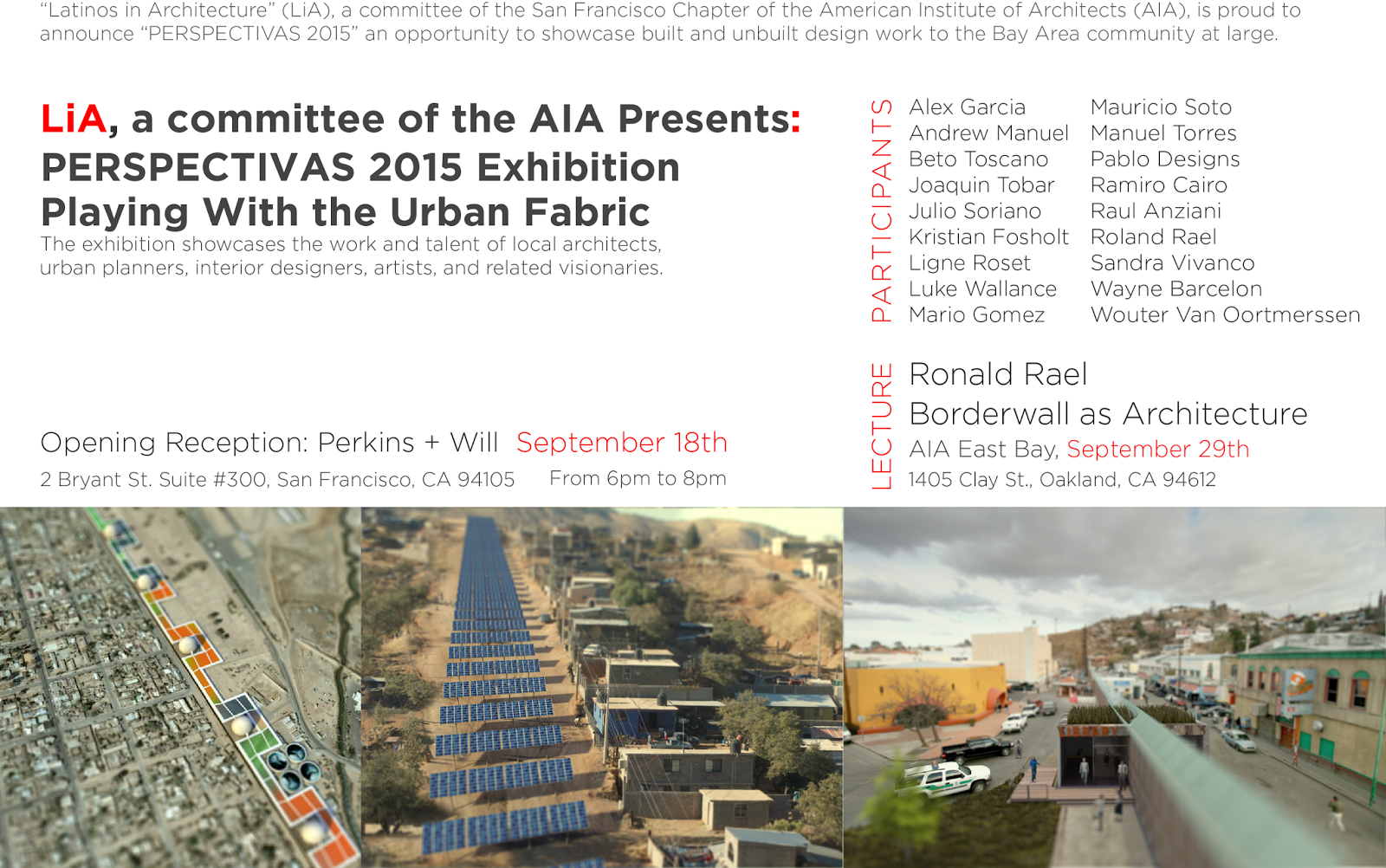 Last Friday September 18th we had a very successful opening for Perspectivas 2015 "Playing with the Urban Fabric". We would like to give special thanks to our sponsors ARUP, IGC, Perkins + Will, AIA SF, Nomadic Coffee, Pablo Designs, and Ligne Roset.